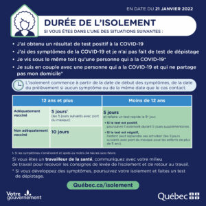 Voici deux documents sur les actions à prendre en cas de symptômes de la COVID-19 et la durée de l’isolement requis, en fonction de votre situation.